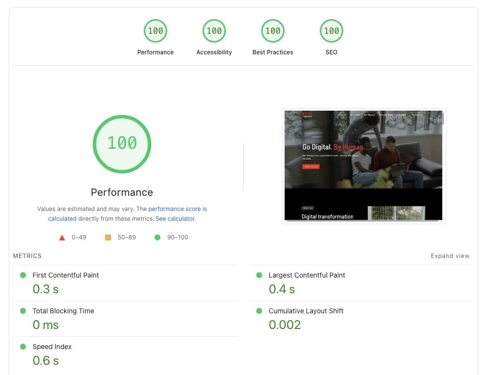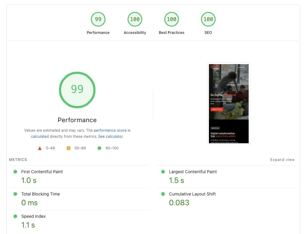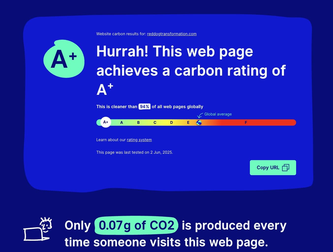 Das Ergebnis ist eine schlanke, werteorientierte Website, die Folgendes verkörpert RedDog Transformationund bietet ihnen gleichzeitig eine solide Grundlage für ihr Wachstum. Die Website erreicht eine perfekte 100/100 Leistungsbewertung sowohl auf dem Handy als auch auf dem Desktop, und eine A+ Kohlenstoff-Bewertung.