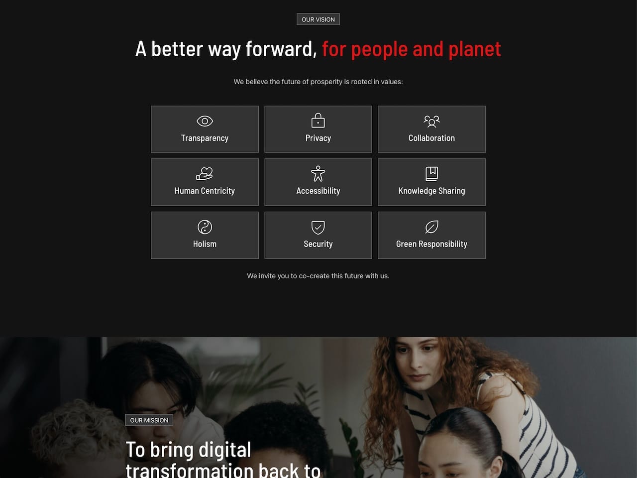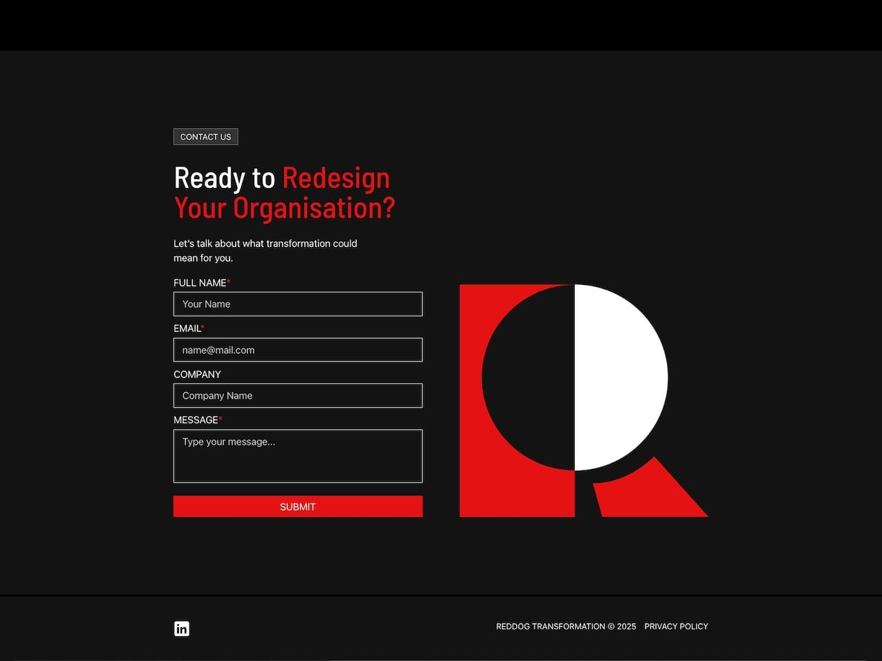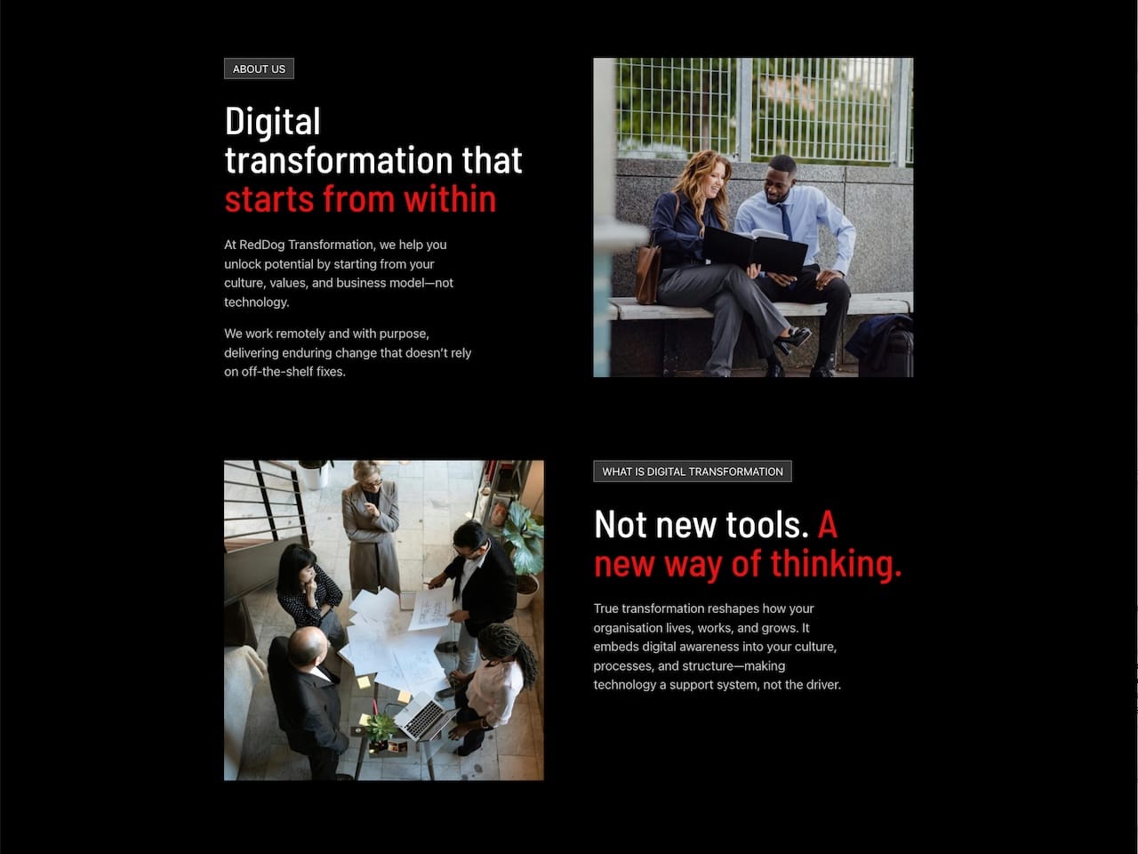 RedDog TransformationDas in London ansässige Beratungsunternehmen für digitale Transformation benötigte eine einfache, aber aussagekräftige einseitige Website, um seine Werte und Dienstleistungen als Startup zu kommunizieren. Das Ziel war es, eine klare digitale Präsenz zu schaffen, die die Prinzipien Transparenz, Menschenzentrierung und Zusammenarbeit widerspiegelt - und das mit einer Effizienz, die einem Startup-Budget in der Anfangsphase entspricht.